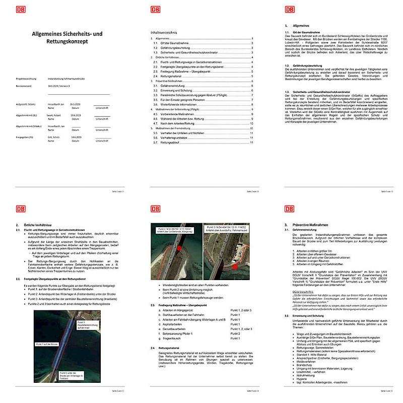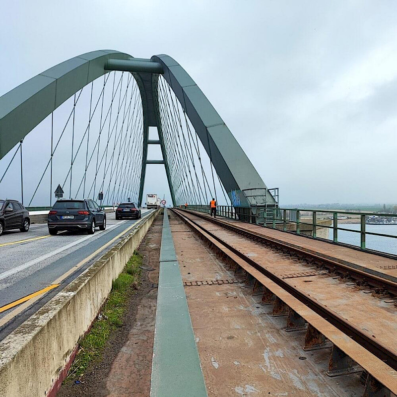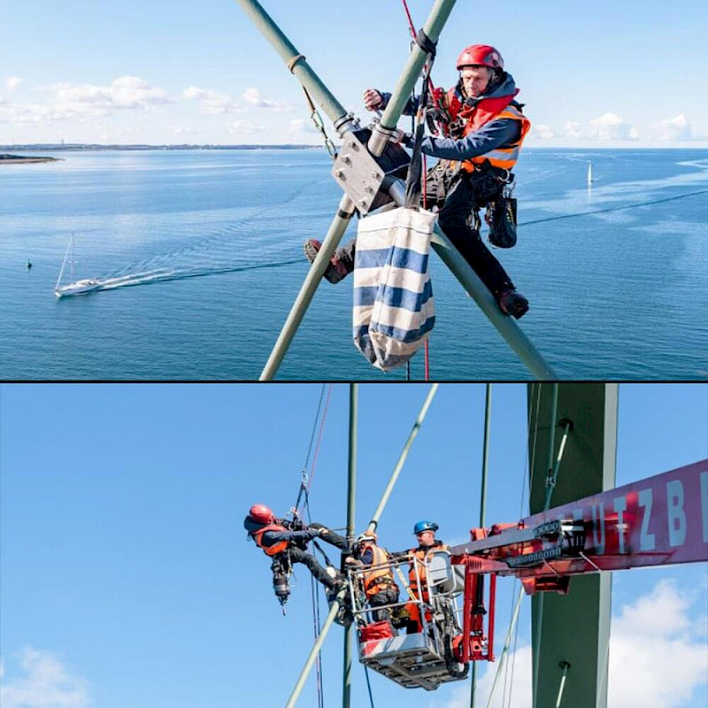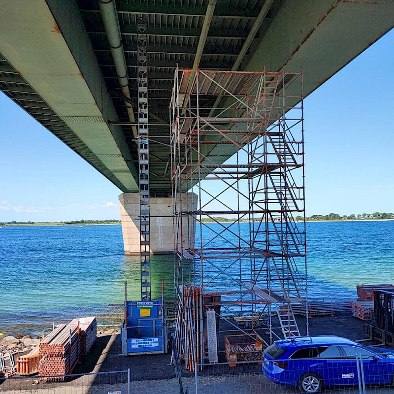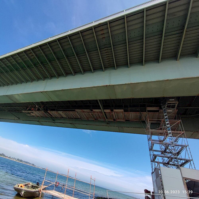 | Leistungsbeschreibung: | Die Fehmarnsundbrücke („Kleiderbügel“) ist eine kombinierte Straßen- und Eisenbahnbrücke, die die Insel Fehmarn in der Ostsee mit dem Festland verbindet. Bauzeit: Januar 1960 bis April 1963. seit 1999 unter Denkmalschutz Umfangreiche Instandhaltungsmaßnahmen für rund 30 Mio. Euro Investition durch die Deutsche Bahn und das Land Schleswig-Holstein. Unter anderem werden alle 80 Tragseile ausgetauscht. Beteiligt sind mehrere spezialisierte Unternehmen mit der Ausrichtung: